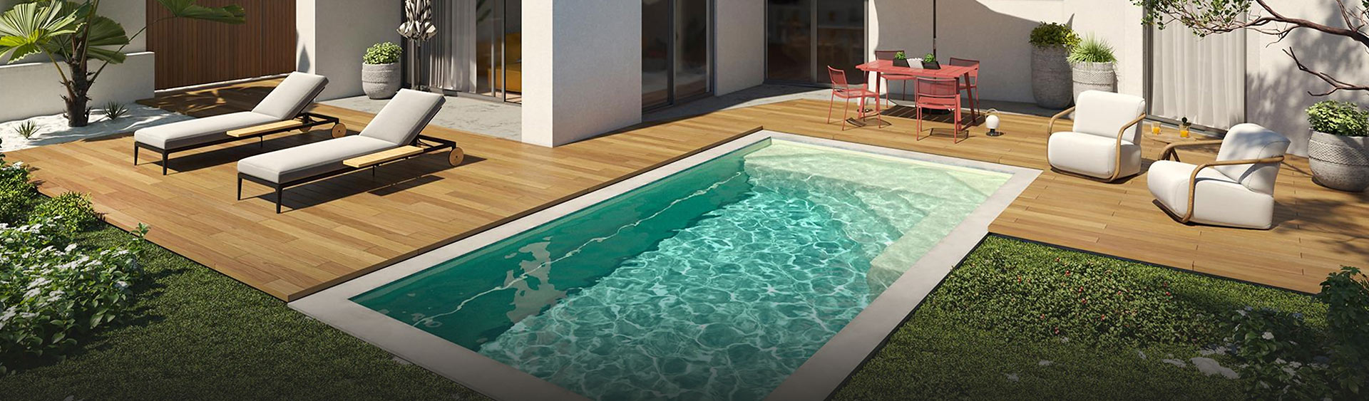 Retrouvez nos modèles de piscines rectangulaires à coque polyester fond plat de la gamme RIVERSO.